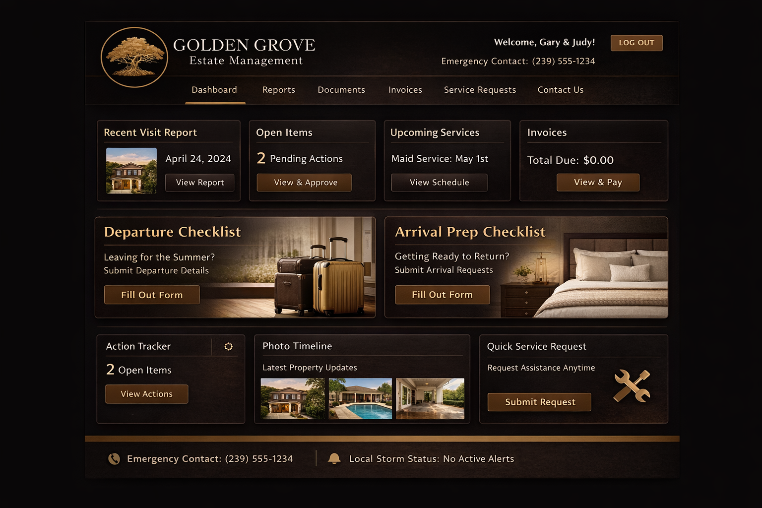 Whether you are here year-round or seasonally, Golden Grove provides ongoing oversight designed to protect, maintain, and represent your home with a higher standard of care.
